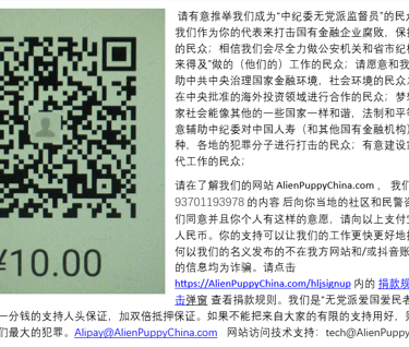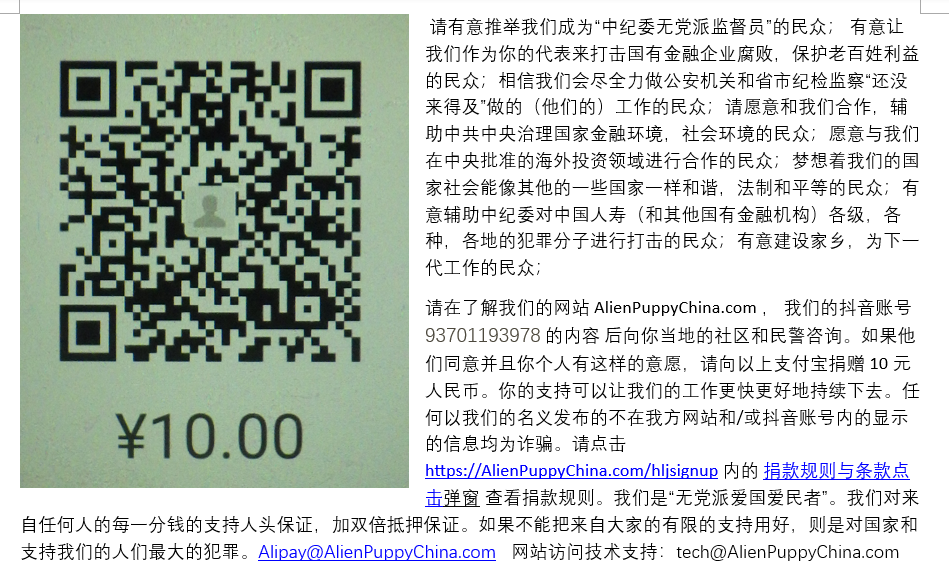 请在了解我们的网站 AlienPuppyChina.com , 我们的抖音账号93701193978 的内容 后向你当地的社区和民警咨询。如果他们同意并且你个人有这样的意愿,请向以上支付宝捐赠10元人民币。你的支持可以让我们的工作更快更好地持续下去。任何以我们的名义发布的不在我方网站和/或抖音账号内的显示的信息均为诈骗。请点击https://AlienPuppyChina.com/hljsignup 内的 捐款规则与条款点击弹窗 查看捐款规则。我们是“无党派爱国爱民者”。我们对来自任何人的每一分钱的支持人头保证,加双倍抵押保证。如果不能把来自大家的有限的支持用好,则是对国家和支持我们的人们最大的犯罪。Alipay@AlienPuppyChina.com 网站访问技术支持:tech@AlienPuppyChina.com